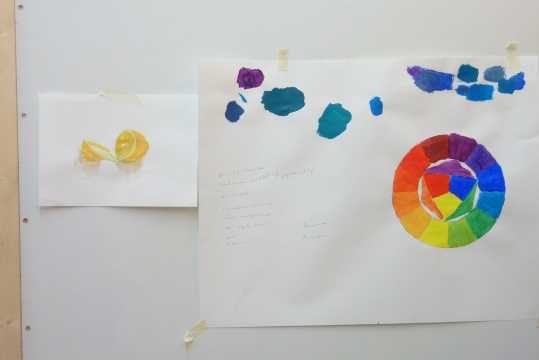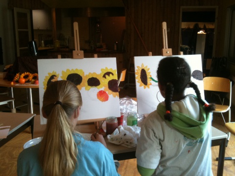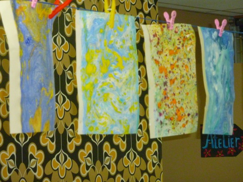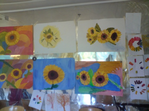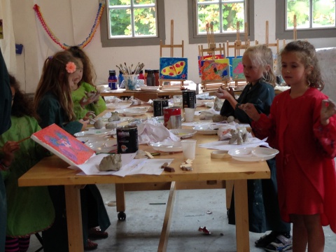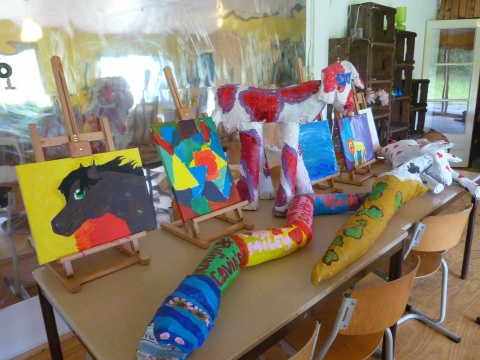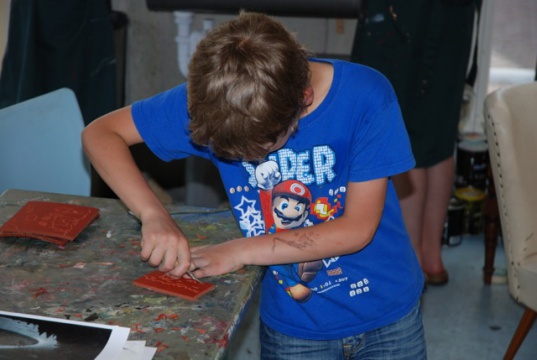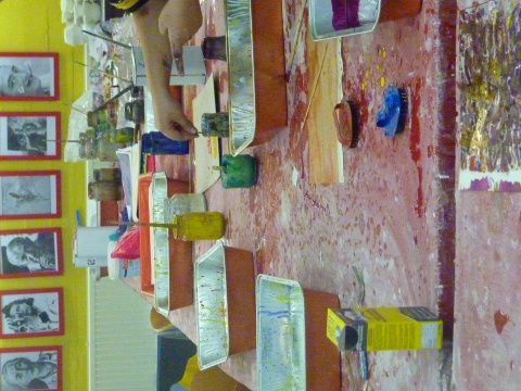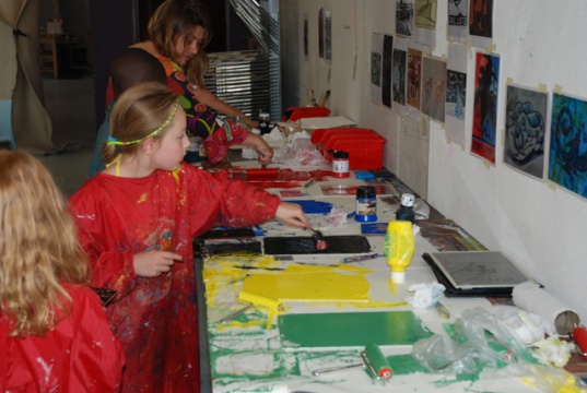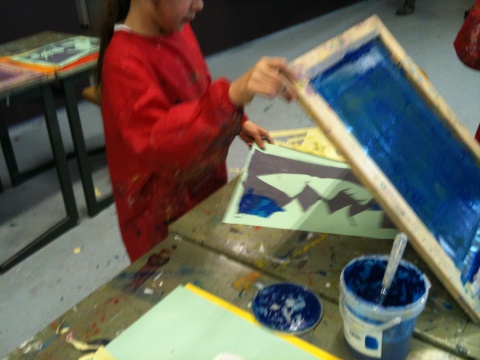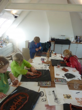 Zeefdrukfotos van een kinderworkshop, linoworkshops, marmeren en zelf een boekje maken, fossielafdrukken maken, met hout en gips figuren maken geinspireerd op Giacometti, groepsworkshops vanuit een foto een reuze schilderij maken....basislessen tekenen en schilderen, workshop stilleven tekenen/schilderen,en natuurlijk ook "after Nature" direkt in het landschap met een veldezel.