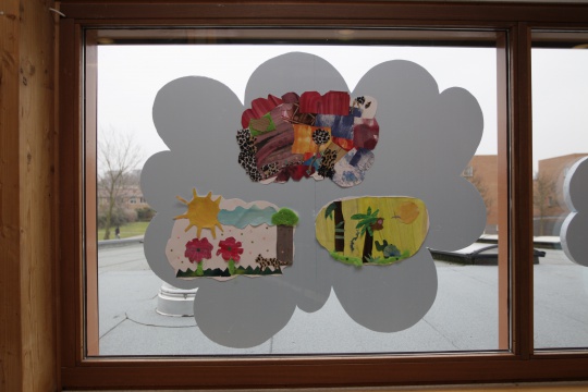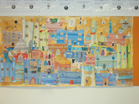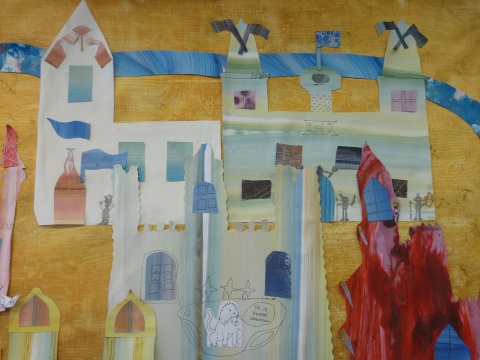 B/v een groot Banier met collagetechniek in de klas gemaakt naar het thema Middeleeuwen of het thema Dromen...