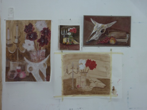 Bij de fotos van diverse werkshops zie je dat er verschillende thema's en technieken zijn.En plein Air schilderen, zeefdrukworkshops, linosnedes, marmeren....maar ook gips, klei, schilderen naar stilleven, of ander thema....